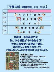| 内容 | 様々なスポーツを楽しむことができる“スポーツ体験広場”でピックルボールやモルックなどを体験しよう! 体験してスタンプを集めるとスーパーボールすくいができるよ😄 午後からは玉入れや障害物競走などの運動会種目を実施します😊 事前の予約が必要なプログラムはありません、当日参加OKです。 |