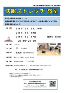 | 内容 | なかなか寝付けない人にオススメの教室です!自律神経を整えて心地よく眠ることができる体質を目指しましょう! |