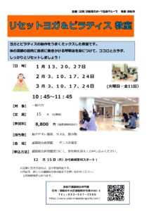 ヨガとピラティスの動作をうまくミックスした運動教室です!体の深部にある筋肉に自然に働きかける呼吸法を身につけてココロとカラダ、しっかりリセットしましょう!