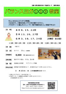 | 内容 | ヨガの呼吸法を意識して心と体のバランスを身につけましょう!ピラティスボールを使ったり、リズム体操を取り入れてみたり、一粒で何度もおいしい教室です♪ |
