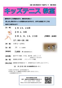 | 内容 | 室内のテニス教室だから雨の日でも安心!まずは気軽にテニス、はじめてみましょう♪ |