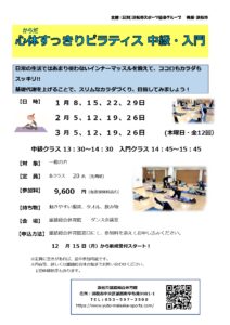 - 1月スタートコース 1月8日・15日・22日・29日/2月5日・12日・19日・26日/3月5日・12日・19日・26日 木曜日 全12回(入門クラス)14:45~15:45 (中級クラス)13:30~14:30