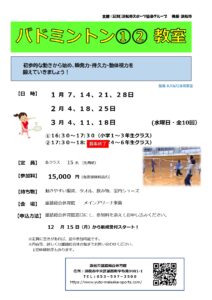 バドミントン教室 1月スタートコース 1月7日・14日・21日・28日/2月4日・18日・25日/3月4日・11日・18日 水曜日 ①16:30~17:30 ②17:30~18:30 全10回