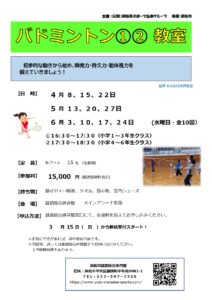 | 内容 | 近年は男女ともに日本選手の世界大会での活躍が話題になっています! バドミントンの基礎を楽しく学ぼう ♪ |