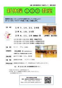 | 内容 | 音楽に合わせて美しく身体表現をするスポーツである新体操 柔軟性やリズム感が自然に身に付きますよ♪ |